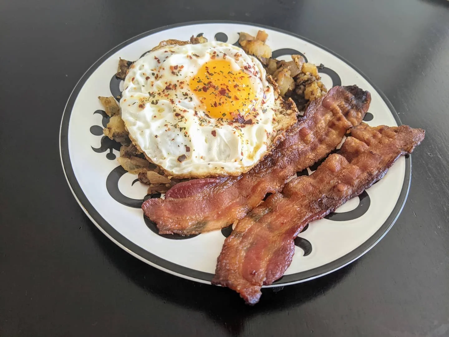 View fullsize Start your day off with #applewoodsmokedbacon #crispyeggs and #homefries. I like to dip the bacon in the yolk.